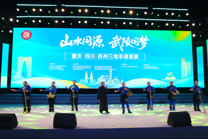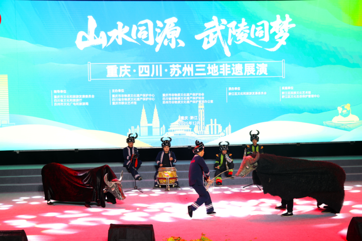 12月19日晚,“山水同源 武陵同夢——重慶·四川·蘇州三地非遺展演”活動在重慶市黔江區舉行。來自重慶、四川、蘇州三地的演職人員展演了10多個國家級、省級非遺項目。江蘇蘇州評彈《楓橋夜泊》、昆曲《牡丹亭·驚夢》,四川松潘花燈、羌族服飾走秀,重慶秀山花燈、萬盛金橋吹打等三地不同特色的非遺匯聚一堂,交相輝映,綻放異彩,為現場觀眾奉上了一場精彩紛呈的文化藝術視聽盛宴。